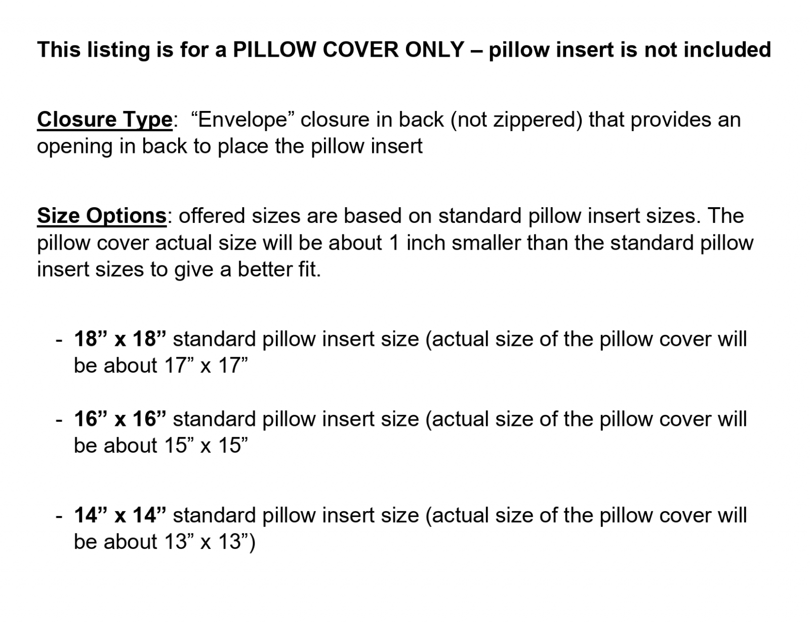 • 14” x 14” standard pillow insert size (actual size of the pillow cover will be about 13” x 13”)