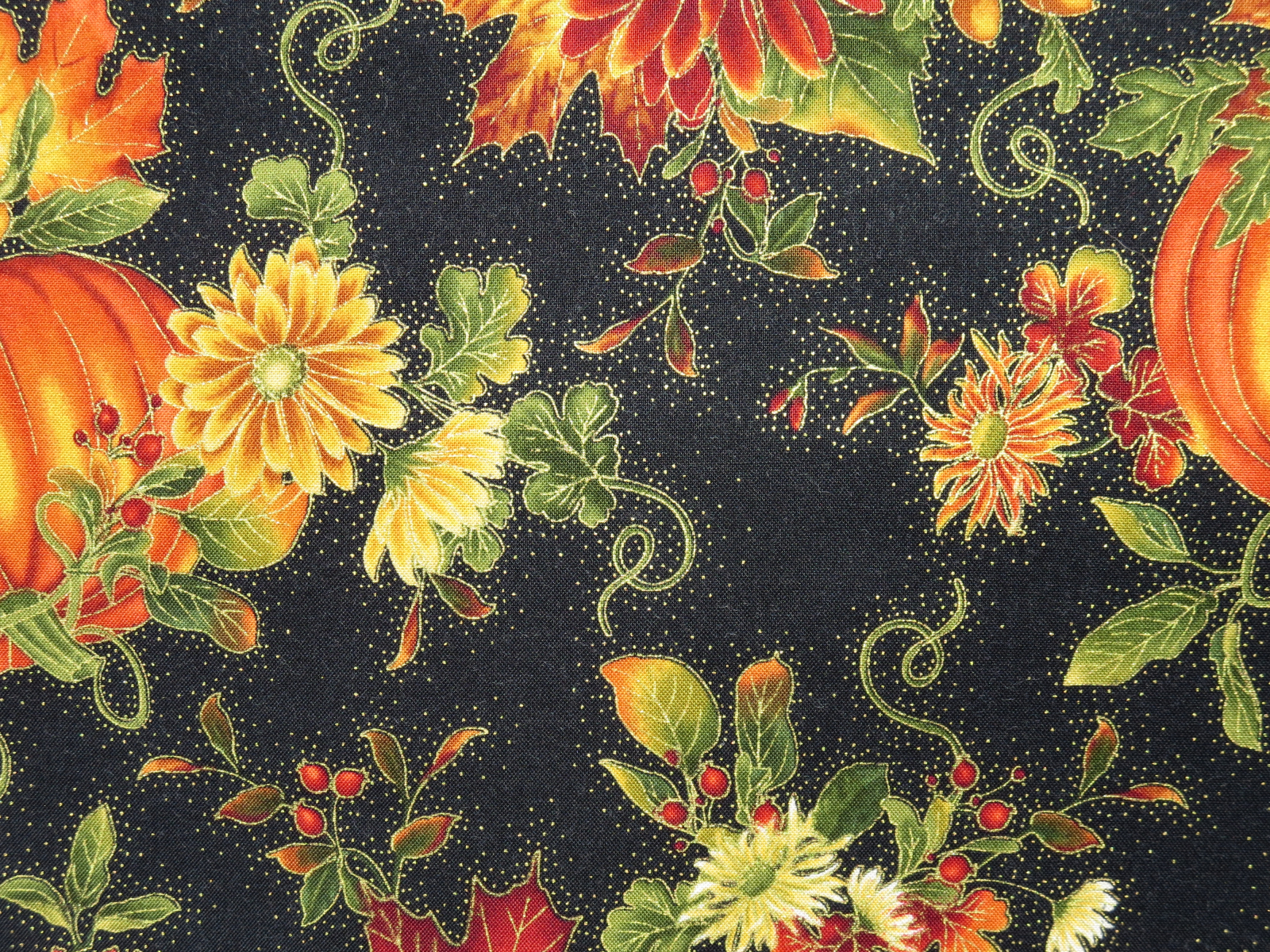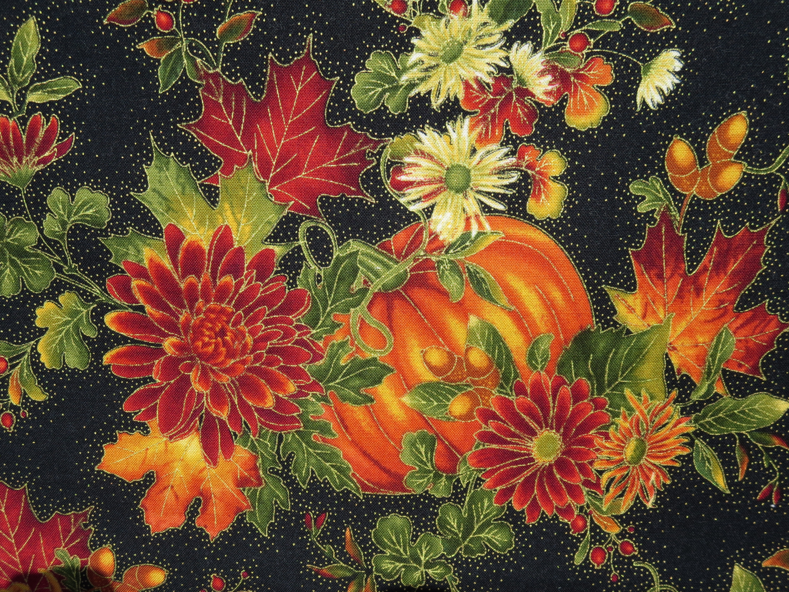 Fall or Thanksgiving table runner made from a pretty floral print featuring mum flowers and pumpkins. Colors in the print include dark red, yellow, cream, gold, dark green, orange and with little gold dots scattered around on a black background. 100% cotton print and machine washable. Runner has squared ends with a choice of three widths and eight lengths. Note that the pattern placement of the flowers and pumpkins will vary from the item shown in photos. Matching napkins and tea towels sold separately. (see links below).