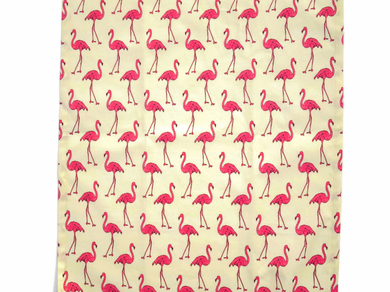 Set of two pink flamingo tea towels on a cream colored background. Fabric is 100% cotton (not terrycloth) and I pre-shrink before sewing. Sold in sets of 2. Size is 18"x 28" (45cm x 71.1cm), single layer (not reversible) with a hook loop in one corner.