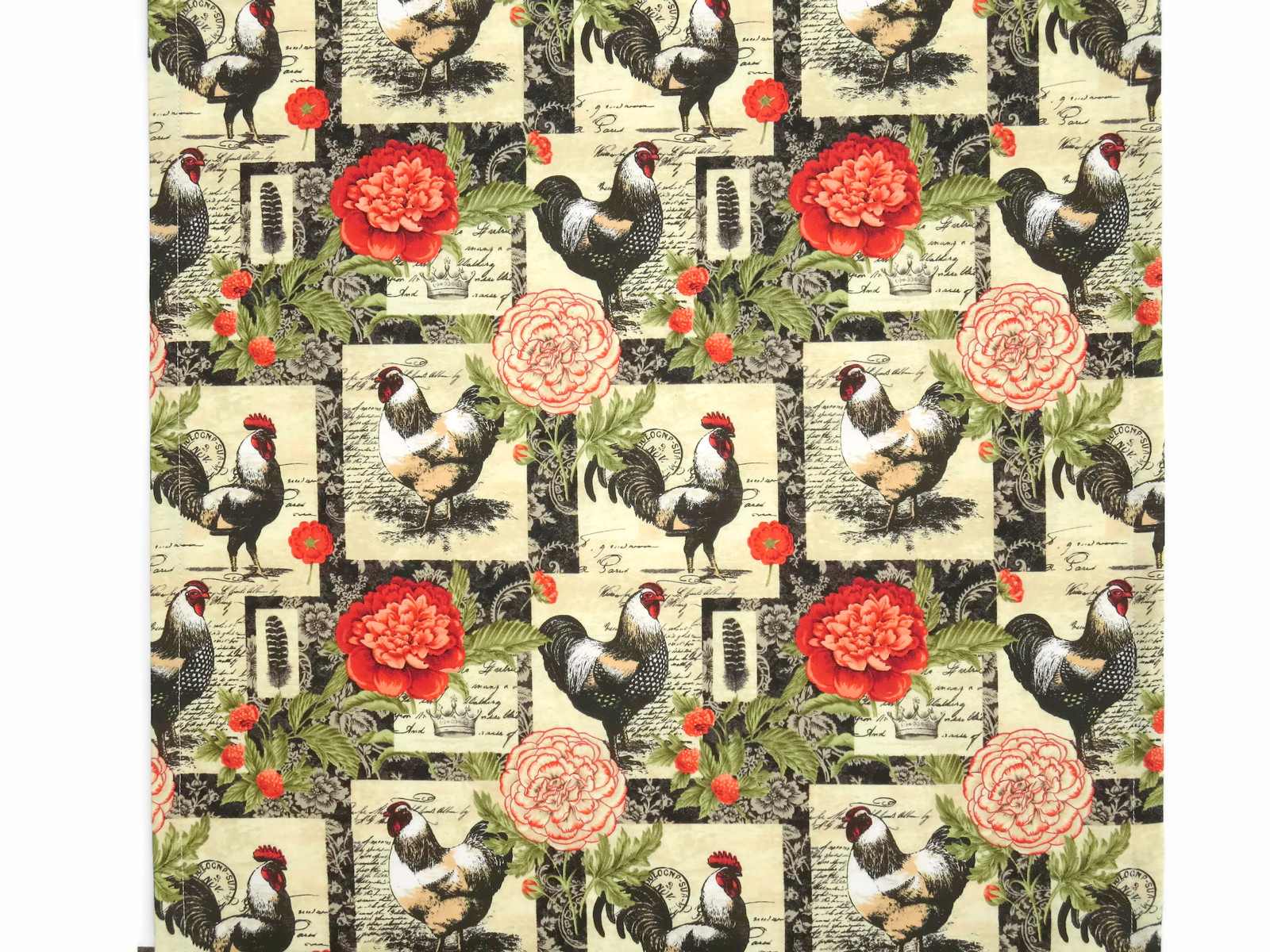 Set of 2 rooster / chicken and floral tea towels in red, black, green and cream. Fabric is 100% cotton (not terrycloth) and I pre-shrink before sewing. Sold in sets of 2. Size is 18"x 28" (45cm x 71.1cm), single layer (not reversible) with a hook loop in one corner.