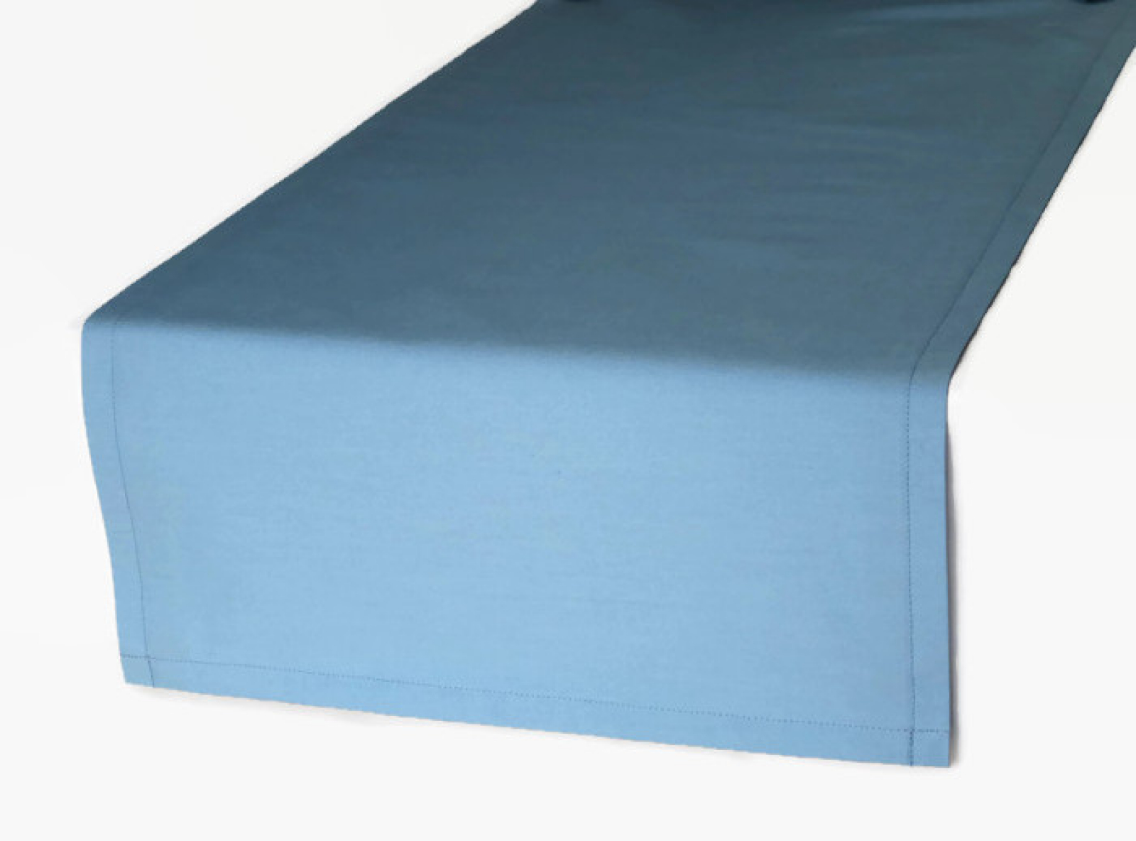 Solid blue cloth table runner in a choice of four blue shades, light blue, turquiose, royal blue and navy (shown in 2nd photo). Runner has squared ends and is lined with a lightweight solid white fabric. Both fabrics are 100% cotton. Choice of three widths and eight lengths. Matching placemats and napkins are sold separately (see links below). The runner shown in photos is the color "Candy Blue".